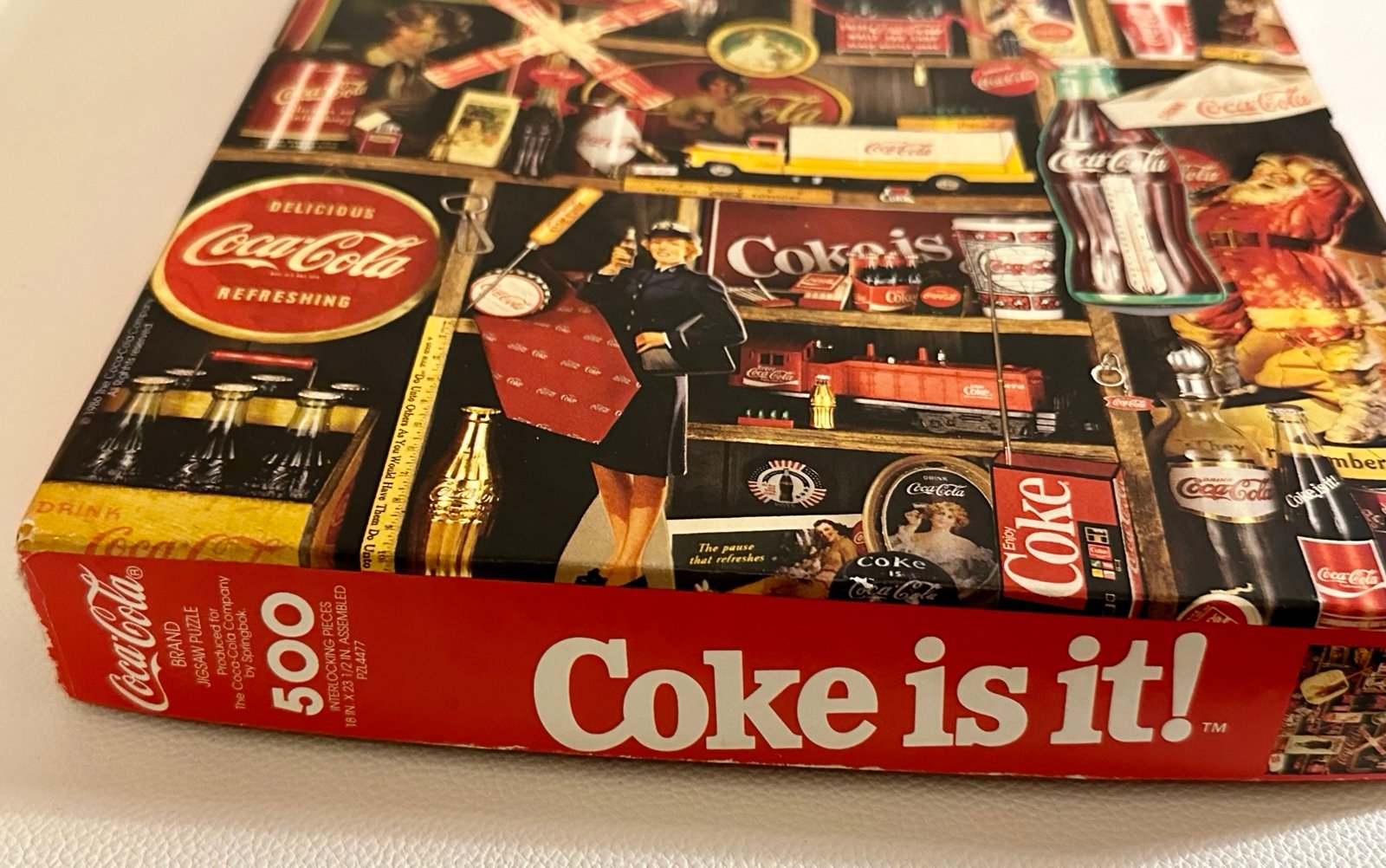 Relive the iconic Coca-Cola "Coke Is It!" era w/ this Springbok 500-piece vintage puzzle (No. PZL4477). Featuring vibrant Coke memorabilia artwork, this puzzle measures 18" x 23.5" when complete. Produced in the USA for The Coca-Cola Company, it's a collectible gem for puzzle lovers & Coke enthusiasts.